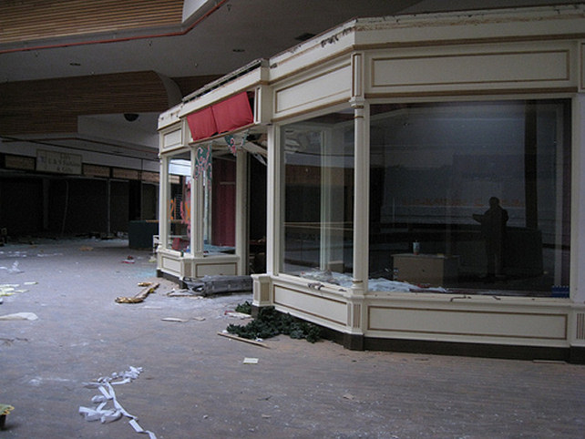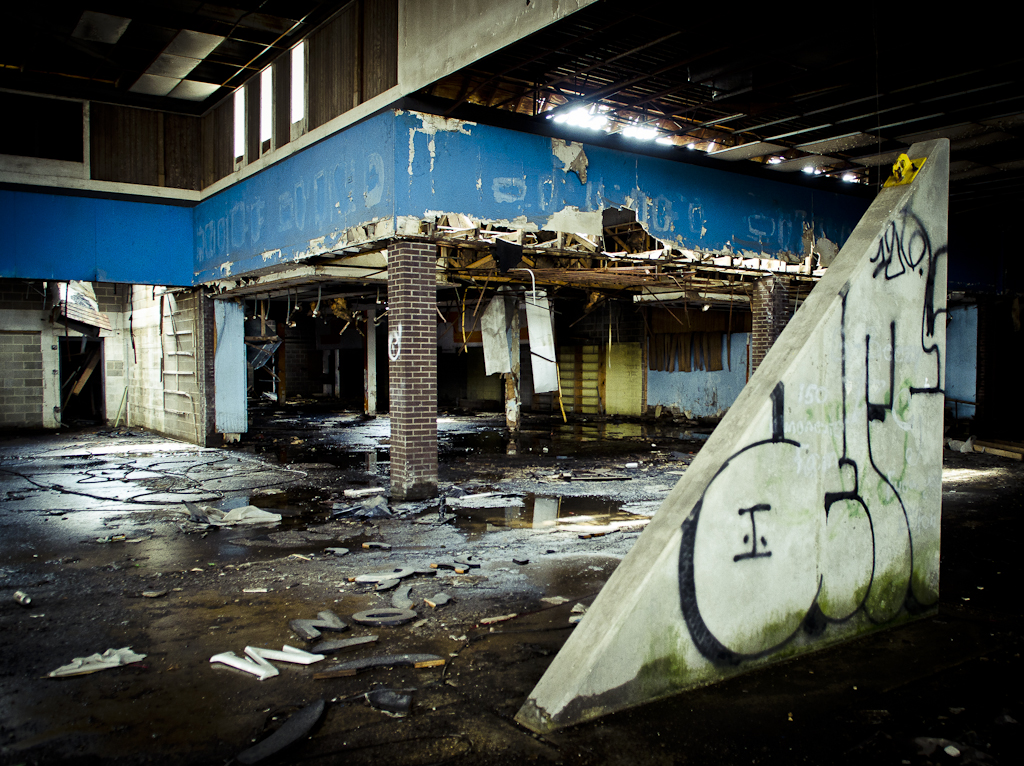 We were standing in a corner of the mall, facing two different walkway options that would take us deeper into the structure. This part of the mall was fairly well-preserved, but dirtied from where other teenagers had come and hung out; they probably hadn’t attempted to go in very far. Above us was a large skylight, shaped like a hexagon and matted with dirt and mold from the outside. The area around us was thick with the smell of decay. Greg quickly took a picture of what used to be either a flower shop or a boutique. I kicked at some of the toilet paper at my feet, obviously discarded during a failed TP-ing. “This is so far disappointing.” Greg turned and picked up a dusty glass object; a discarded water bong. “Hey Gabrian, check this out.”